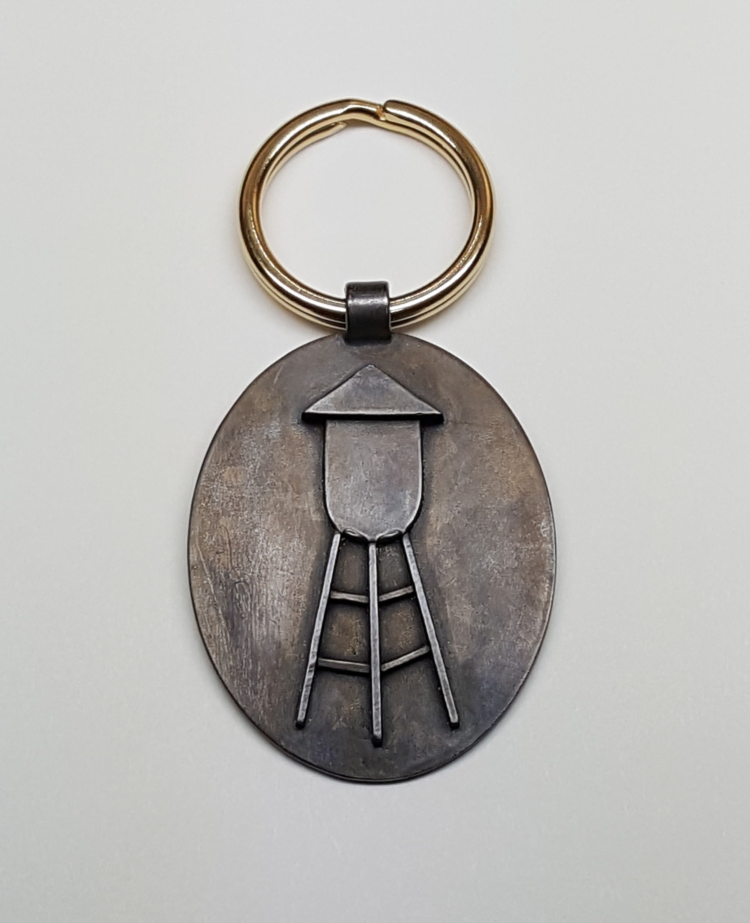 Water tower tag in sterling silver, on a sterling split ring keyring, all with an Antiqued finish. Tag measures approx. 1 1/2" wide x 2" long, and ring is approx. 1" wide. Available in Shiny Sterling (style #600-004) by special order.